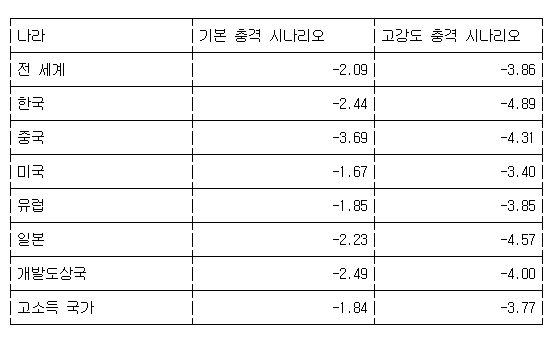 나라별로는 한국의 GDP를 2.44% 줄이고 미국(-1.67%), 유럽(-1.85%), 일본(-2.23%), 중국(-3.69%) 등도 역시 위축될 것으로 세계은행은 분석했다.