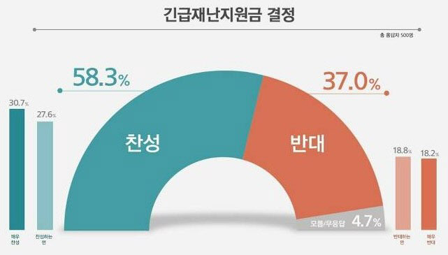 1일 오마이뉴스가 리얼미터에 의뢰해 전국 성인남녀 500명을 대상으로 여론조사를 실시한 결과에 따르면 이번 재난지원금 정책에 대한 찬성 응답은 58.3%였다. 반대 응답은 37.0%, 모름·무응답이 4.7%였다.