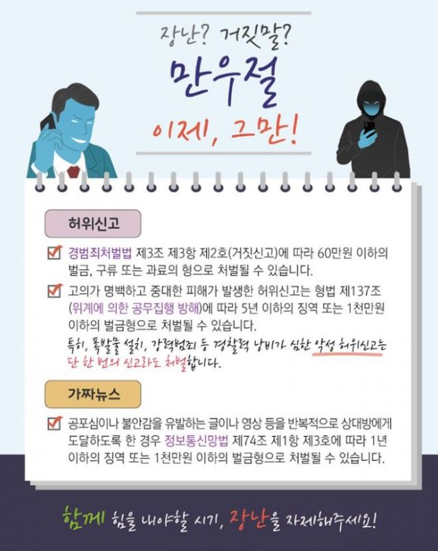 특히 폭발물 설치, 강력 범죄 등 경찰력 낭비가 심한 악성 허위신고의 경우엔 단 한 번의 신고라도 처벌을 받게 된다.