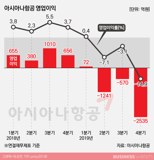 올해는 코로나19 사태까지 더해져 전망이 더 어둡다. 지난 2월부터 코로나19가 확산되면서 현재 아시아나항공의 운항률은 7.6%까지 떨어진 상태다.