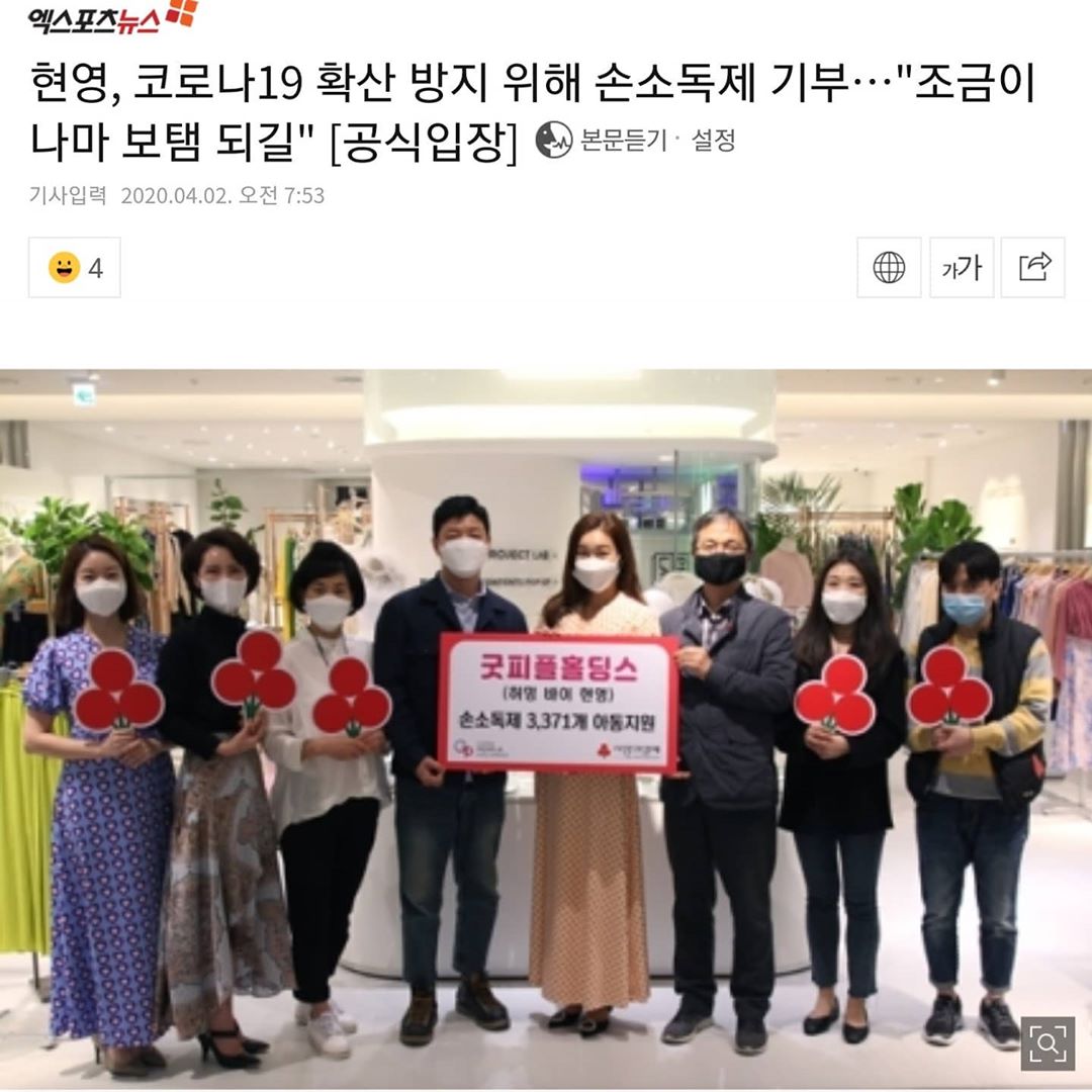 이를 본 누리꾼들은 "현영 언니 정말 멋있어요", "대단한 일 하셨네요", "회사 운영도 기부도 모두 1등!" 등의 댓글로 현영을 칭찬했다.