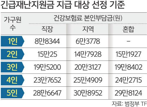 직장가입자 가구의 경우 건보료가 1인 가구 8만8334원, 2인 15만25원, 3인 19만5200원, 4인 23만7652원 이하면 각각 40만원, 60만원, 80만원, 100만원을 지원받는다. 4인 기준으로 지역가입자 가구는 25만4909원, 혼합가구는 24만2715원 이하여야 한다.