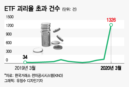 지난 1일 한국거래소에 따르면 지난달 ETF 괴리율 초과건수는 1326건을 기록했다. 지난해 3월(34건)과 비교해 39배, 직전월(140건)보다 9배 넘게 늘었다. 거래소는 국내 ETF는 순자산가치의 1% 이상, 해외 ETF는 순자산가치의 2% 이상 고평가 혹은 저평가됐을 경우 괴리율이 초과됐다고 평가하고 공시하도록 하고 있다.