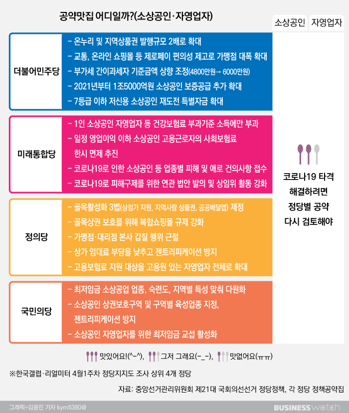 이번 총선때도 어김없이 정당들은 소상공인과 자영업자들을 위한 달달한 공약들을 내놨어요. 정당별 공약 살펴볼게요.