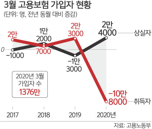 코로나19 확산에 따른 ‘고용쇼크’가 정부 통계로 확인됐다. 2017∼2019년 매번 ‘플러스’값을 기록했던 전년 대비 3월 고용보험 취득자 증감 수는 올해 약 11만명 ‘마이너스’로 집계됐다. 사회적 거리두기가 시행되면서 기업의 신규채용 계획이 일제히 미뤄진 것이 주요 원인이다. 지난달 29세 이하 청년층에서만 약 29만명이 감소했다.