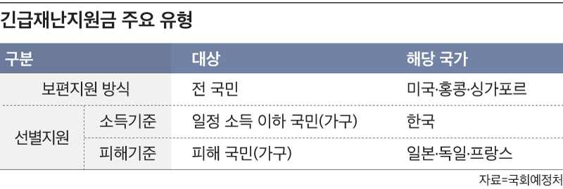 보편적 지원을 하는 국가로는 미국과 홍콩, 싱가포르가 대표적이다. 미국은 연소득 7만5000달러(부부합산 15만달러) 이하를 지급기준으로 정했다. 이 기준을 초과할 경우 초과소득 100달러 당 지급액을 5달러씩 차감하고, 연소득 9만9000달러 이상은 지급 대상에서 제외하기로 했다. 이같은 대책으로 전국민의 93.6%가 재난지원금을 수령하게 된다. 홍콩은 전체 영주권자에 1000만홍콩 달러, 싱가포르는 전국민에게 소득에 따라 100~300싱가포르 달러를 지급한다. 일본은 피해를 기준으로 한 선별적 지원방식을 택했다. 소득이 50% 이상 줄거나 주민세가 면세점 이하로 감소하는 가구를 기준으로 둬 총 5800만가구 중 1000만가구가 수령하도록 했다.