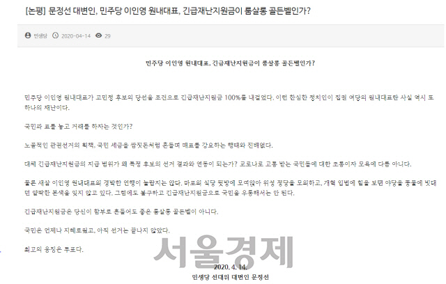 이인영 더불어민주당 원내대표가 제21대 총선 격전지 중 하나로 꼽히는 서울 광진을 선거구에 출마한 고민정 후보 지원을 위해 “고민정 후보를 당선시켜주면 저와 민주당은 100% 국민 모두에게 긴급재난지원금을 드리겠다”고 한 발언의 파장이 커지고 있다.