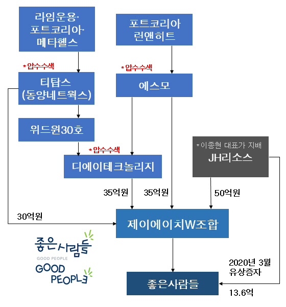 코스닥 기업 좋은사람들 에 투자했던 주요 주주들이 라임자산운용 사태로 검찰의 수사망 안에 들어가면서 회사를 인수한 최대주주의 자금줄이 사실상 막힌 것으로 보인다. 최대주주 ‘제이에이치W투자조합’은 좋은사람들 인수 후 자금 출처를 숨겨오다 수차례 공시를 번복한 끝에 지배구조를 밝힌 바 있다. 주요 주주들의 지원을 받지 못한 제이에이치W투자조합은 외부 차입으로 자금을 마련해 이번 증자에 참여했고 지분율은 한 자리대로 낮아졌다.