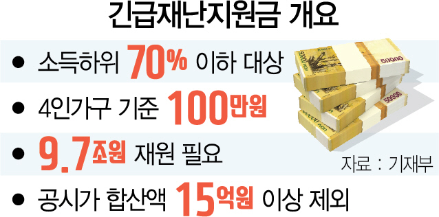 정부가 소득 하위 70% 1,478만가구에 최대 100만원의 긴급재난지원금을 지급한다. 단 공시가격 15억원(재산세 과표 합산액 9억원)을 초과하는 아파트·상가를 보유하거나 금융소득이 연 2,000만원을 넘는 고액자산가 12만5,000가구는 제외하기로 했다. ★관련기사 2면, 본지 4월2일자 8면 참조