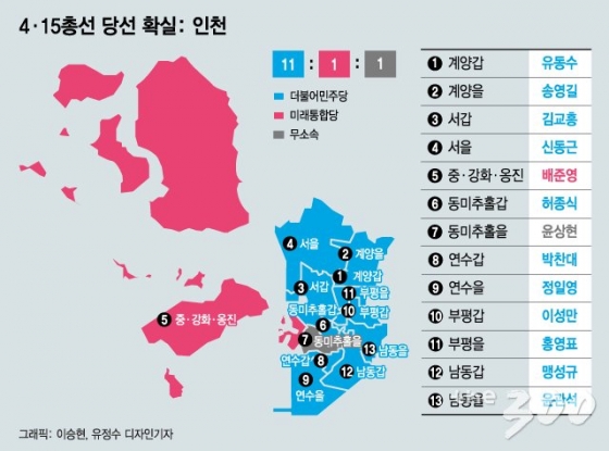 수도권의 ‘보수 텃밭’으로 꼽히는 인천 선거 결과는 민주당의 ‘완승’을 상징적으로 보여준다. 정일영 민주당 당선인(인천 연수을)의 승리가 대표적이다. 정 당선인은 이정미 정의당 후보와 ‘표 분산’에도 끝내 민경욱 통합당 후보를 제치는 이변을 일으켰다.