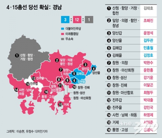통합당은 부산 18석 중 15석에서 당선인을 배출했다. 16석이 걸린 경남에선 12석을 확보했다. 울산에선 6석 중 5석을 차지했다. 또 무소속으로 출마한 홍준표(대구 수성을), 김태호(경남 산청함양거창합천) 당선인 등이 승리하면서 2년 후 대선을 앞두고 숨통을 틔웠다.