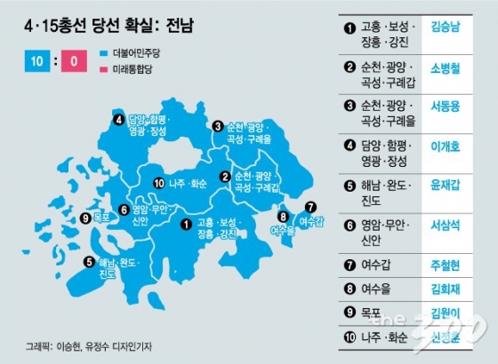 민주당이 호남을 사실상 석권하며 승부의 종지부를 찍었다. 민주당은 28석이 걸린 호남에서 27석을 차지했다. 별다른 이변도 없었다. 국민의당 돌풍에 휩쓸려 3석에 그쳤던 4년 전과 비교해 호남에서만 24석이 늘었다.