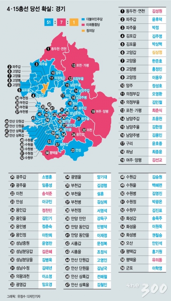 지역별 결과를 보면 121석이 걸린 수도권에서 민주당이 완승을 거뒀다. 민주당은 서울 41석, 경기 51석, 인천 11석을 차지, 수도권에서만 103석을 확보했다. 민주당의 역사적인 승리로 이어진 가장 큰 이유다.