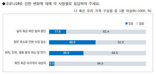 조사결과에 따르면 응답자의 48.0%는 코로나19에 따른 변화로 ‘업무 축소로 인한 수입 감소’를 꼽았다. ‘취직, 진학, 결혼 등의 취소 및 연기’는 35.5%, ‘실직 혹은 하던 일의 중단’은 17.6%, ‘확진 혹은 자가격리 대상자’는 5.5%였다.