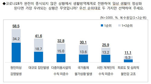 하지만 서울시민의 63.6%는 오는 19일부터 생활방역체계로 전환하는 것은 시기상조라고 답했다. 일상과 방역 활동이 병행됐을 경우 우려되는 점으로는 △무증상 감염 등 원인 미상 감염(58.5%) △새로운 대규모 집단감염 발생(41.6%) △다중이용시설의 수칙 미준수(32.8%) △국가통제 불가상황 발생(30.1%) △시민 개개인의 수칙 미준수(25.9%) 등이 꼽혔다.