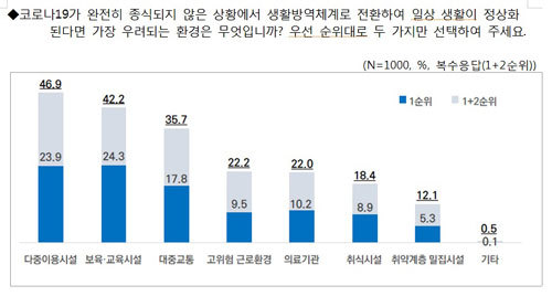 특히 집단감염이 가장 우려되는 시설·환경으로 서울시민의 46.9%는 유흥 및 종교시설 등 다중이용시설을 꼽았다. 이어 ‘보육 및 교육시설’(42.2%), 대중교통(35.7%) 등의 순이었다. 직장과 병원, 학교, 대형마트 등 다중이용시설이 생활방역 체계로 전환하기에 앞서 준비해야 할 점으로는 △공용공간내 밀접접촉 최소화(30.3%) △개인수칙 준수 관리(27.6%) △신속대처 가능한 시스템(17.9%) △시설물 위생관리(16.0%) 등이 꼽혔다.