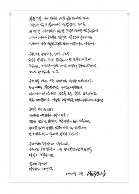 박 시장은 "아저씨는 우리 친구들이 어서 빨리 학교에 갈 수 있도록 열심히 노력할게요"라며 "미안하고 고마워요"라는 말로 편지를 끝맺었다.