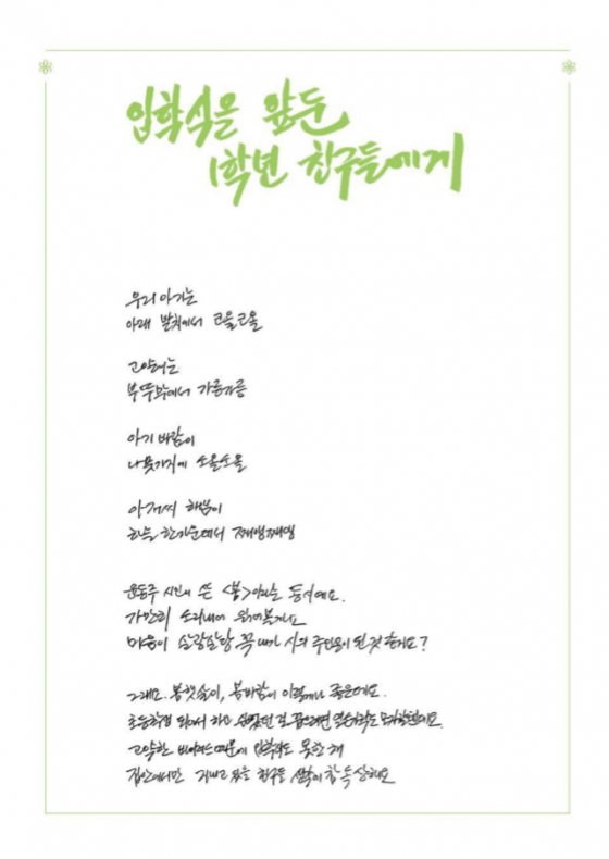 박 시장은 편지에서 윤동주 시인의 '봄'을 인용하며 이제 막 초등학교 입학을 앞둔 학생들에게 다정하게 말을 건넸다.