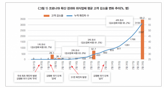 코로나19 발생 이후 외식업체 고객 감소율 추이는 1차 조사(29.1%) 대비 2차 조사(26.1%)에서 소폭(3.0%포인트) 감소하며 진정되는 것처럼 보였으나, 31번 확진자 발생(2월 18일)을 기점으로 대구·경북 지역을 중심으로 급속도로 확산되며, 3차 조사에선 평균 고객 감소율이 32.7%, 4차 조사에서는 59.2%로 껑충 뛴 것으로 조사됐다.