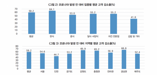 코로나19 발생 이후 외식업체 영향을 업종과 지역별로 구분해 살펴보면, 업종별로는 한식의 고객 감소율이 64.1%로 가장 높게 나타났고 김밥 및 기타 간이음식점업의 고객 감소율이 41.6%로 가장 낮게 나타났는데, 이는 업종별 서비스 유형의 구성(구조비)와 연관이 있다는 게 연구원의 판단이다.