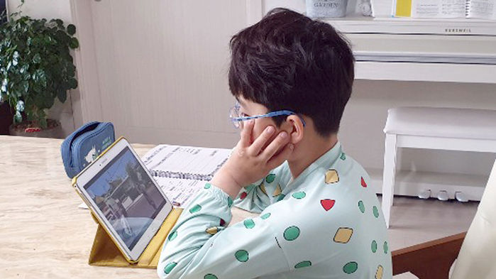 초등학교 1∼3학년의 3차 온라인 개학일인 20일 오전 전북 전주 시내 한 가정에서 초등학교 3학년생이 태블릿 PC로 수업을 듣고 있다.