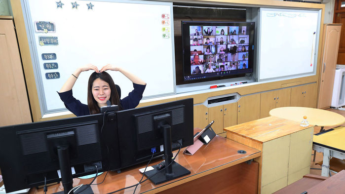 20일 오전 서울 용산구 용산초등학교 3학년 교실에서 선생님이 온라인으로 열린 개학식에서 학생들에게 팔로 하트를 만들어 보이고 있다.