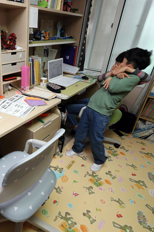 20일 광주 남구 한 아파트에서 초등학교 1·3학년 형제가 온라인 개학을 맞아 재택수업 노트북과 태블릿 PC로 수업을 듣다가 장난치고 있다.
