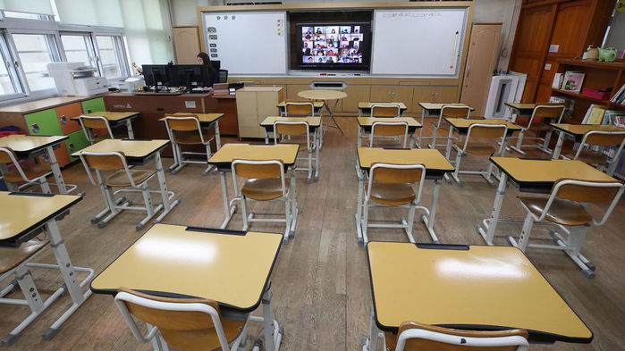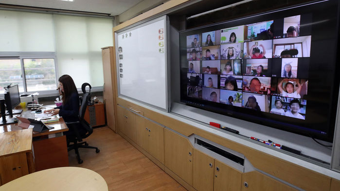 20일 오전 서울 용산구 용산초등학교 3학년 교실에서 선생님이 온라인으로 열린 개학식을 지켜보고 있다.