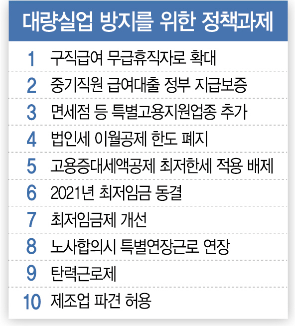 이에 한경연은 고용안정을 위해 무급휴직자에게도 약 3개월간 구직급여를 지원해야 한다고 건의했다. 한계기업이 아닌 중소기업이 직원 급여 지급을 위해 대출을 신청하면 정부 보증으로 연 1%대 저금리를 적용하고 특별고용지원업종에 면세점업·행사대행업·구내식당업(학교급식)·인력파견업 등을 추가해야 한다고 주장했다.