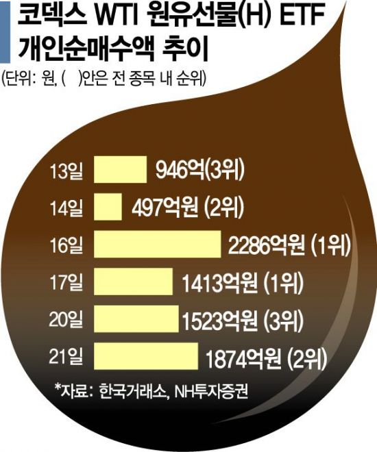 22일 한국거래소와 NH투자증권에 따르면 개인투자자들은 지난 16일부터 21일까지 4거래일간 서부텍사스산원유(WTI)를 추종하는 ETF인 '코덱스 WTI원유선물(H)'를 7096억원 순매수했다. 코스피ㆍ코스닥을 통틀어 기간내 가장 많이 사들인 종목이었다. 같은 기간 2~5위인 현대차(2609억원), SK하이닉스 (2374억원), 삼성전자(1396억원), KB금융(1026억원)의 개인 순매수액을 모두 더한 7405억원과 맞먹는 수준이다.