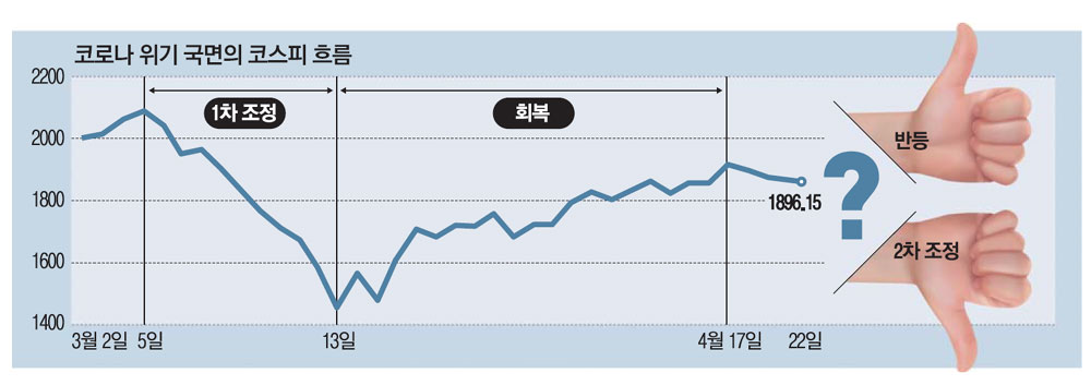 본격적인 하락장이 연출됐던 3월 코스피는 2002.51로 시작해 지난달 23일 1482.46을 기록하며 저점을 찍었다. 3주 만에 지수가 26% 하락했다. 이후 3월 31일 코스피는 1754.64까지 반등하며 18.4% 회복했다. 4월 들어서는 완연한 회복세가 목격됐다. 지난 1일 1685.46으로 시작한 코스피는 22일 1896.15까지 회복해 약 3주 만에 12.5% 상승했다.