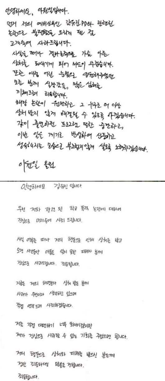 김유진 PD 또한 자필 사과문으로 "우선 저와 관련된 학교 폭력 논란에 대하여 진심으로 머리 숙여 사죄 드린다"며 "사실 여부를 떠나 저의 행동으로 인해 상처를 받고 오랜 시간 동안 아픔을 잊지 못한 피해자분께 진심으로 사과드린다. 죄송하다. 지금은 저의 해명보다 상처받은 분께 사과가 우선이라 생각하고 있으며 직접 연락드려 사죄하겠다. 저를 직접 대면하기 너무 화나시겠지만 제가 진심으로 사과할 수 있는 기회를 주셨으면 한다. 저의 행동으로 상처와 피해를 받으신 분들께 정말 죄송하다는 말씀을 전한다. 죄송하다"고 밝혔다.