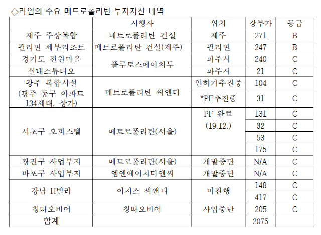 이러한 연유로 메트로폴리탄 사업 대부분이 사실상 실체가 없는 것 아니냐는 의혹이 일었다. 이에 대해 라임과 메트로폴리탄 측은 사업 진행 과정에서 담보 설정을 하지 않아 그런 평가를 받은 것이지 실체가 없는 것은 아니라는 입장이다.