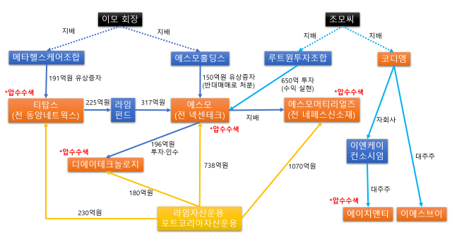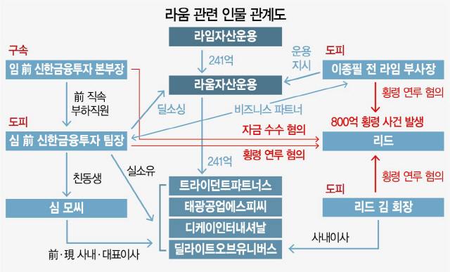 또 라움은 라임의 투자금 수백억원을 심 전 팀장과 그 특수관계인들이 보유한 회사에 몰아준 바도 있다. 앞서 라움은 트라이던트파트너스(81억)·태광공업에스피씨(80억)·디케이인터내셔날(50억)·딜라이트오브유니버스(30억) 등의 사모사채에 투자했다. 그런데 태광공업에스피씨의 사내이사와 디케이인터내셔날의 대표이사는 심 전 팀장의 친동생이었다. 또 친동생은 트라이던트파트너스의 사내이사도 맡고 있다. 딜라이트오브유니버스의 사내 이사에는 800억원대 횡령 사건이 발생한 리드의 김 회장이 있다.[▶[단독/시그널] ‘라임 OEM’ 라움, ‘이종필 사단’에 241억 몰아줬다]