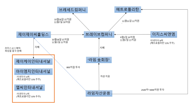 다만 메트로폴리탄의 법인 중 한곳인 이지스씨엔엠는 이 부사장의 지시로 스타모빌리티의 김 회장 페이퍼컴퍼니인 ‘브레이브컴퍼니’에 35억원을 대여해준 것으로 확인됐다. 특히 브레이브컴퍼니는 또 다른 라임의 투자처인 J사로부터도 30억원을 대여받은 것으로 나타났다. 이처럼 이 부사장이 라임 투자사의 자금 집행을 좌지우지 해온 것을 감안하면 메트로폴리탄 자금 상당 부분이 엉뚱한 곳에 쓰였을 가능성이 적지 않다.[▶[단독] ‘라임 金회장’ 라임 투자사서 빌린 65억 도피자금 쓰였나]