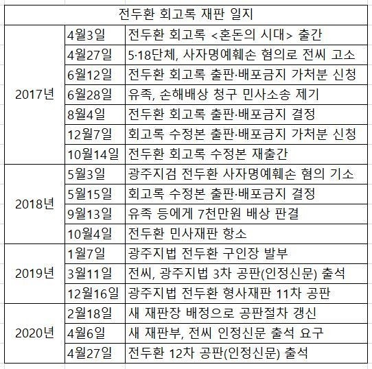 전두환(89)씨는 2017년 4월 출간한 회고록에서 자신은 5·18민주화운동과 무관하고 무차별적인 살상행위는 없었다고 주장했다. 오히려 자신을 광주 상처 치유를 위한 씻김굿의 제물이라고 표현해 희생자 가족들과 시민들의 분노를 자아냈다. 헬기사격을 증언한 고 조비오 신부에게는 ‘성직자라는 말이 무색한 파렴치한 거짓말쟁이’, 고 아놀드 피터슨 목사에게는 ‘목사가 아니라 가면을 쓴 사탄’이라는 비난도 주저하지 않았다.