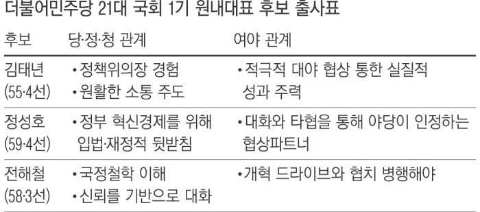 정 의원은 “문재인 정부 후반기 국정과제 추진을 위한 입법적·재정적 뒷받침을 안정적으로 책임지겠다”고 했다. 김 의원은 정책위의장 경험을 내세웠다. 그는 “이미 당·정·청 조율 경험이 많다. 국정운영을 뒷받침할 유능한 원내대표가 될 것”이라고 했다. 전 의원은 “문재인 정부의 국정철학을 이해하고, 청와대 및 내각과 네트워크는 물론 신뢰를 기반으로 대화를 하는 게 중요하다”고 강조했다.