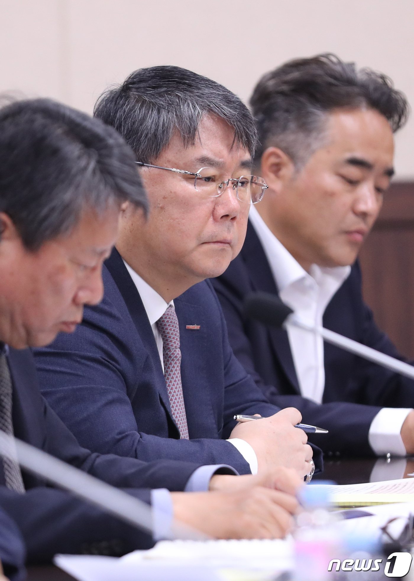 (서울=뉴스1) 박지혜 기자 = 최종구 이스타항공 대표이사가 29일 오후 서울 강서구 한국공항공사 대회의실에서 열린 항공업계 사장단 간담회에서 생각에 잠겨 있다. 이날 손명수 국토부 2차관은 항공업계 사장단들과 만나 신종 코로나 바이러스 감염증(코로나19)사태로 경영악화 위기에 빠진 저비용항공사(LCC)에 대한 현장의 목소리를 청취했다. 2020.4.29/뉴스1