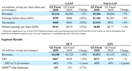 29일(현지시각) 퀄컴은 회계연도 2020년 2분기(2020년 1~3월) 실적을 공개했다. 일반회계기준(GAAP) 매출액과 영업이익은 각각 52억1600만달러와 9억9100만달러다. 전년동기대비 각각 4.7%와 5.4% 증가했다.