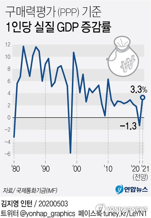 한편 IMF는 올해 전 세계의 PPP 기준 1인당 실질 GDP가 4.2% 감소하나 내년에는 4.6% 늘어난다고 전망했다. 한국은 2021년에 3.3% 증가할 것으로 예상된다.
