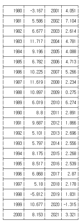 [표] 연도별 한국의 구매력평가 기준 1인당 실질 GDP 증감율(단위 : %)