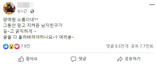 이 씨가 양예원을 저격한 건 이번이 처음이 아니다. 지난해 9월 이 씨는 SNS에서 "양예원 소름이네. 그동안 믿고 지켜 준 남자친구가 길고 굵직하게 글을 다 올려 버려야 하나"라는 글을 올려 파장을 일으켰다.