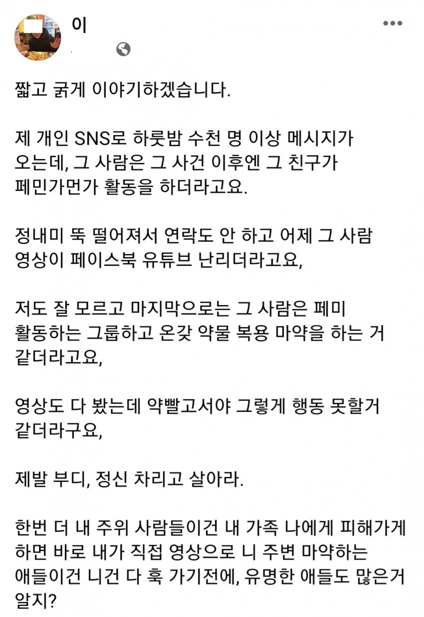 이어 이 씨는 양예원을 향해 "제발 부디 정신 차리고 살아라"라고 저격한 뒤 "그 사람은 페미 활동하는 사람들하고 온갖 약물 마약 하는 것 같았다. 가족이나 친한 사람 건드리면 영상을 만들어서 마약을 하는 네 주위 사람과 너에 대해서 밝히겠다."고 압박하기도 했다.
