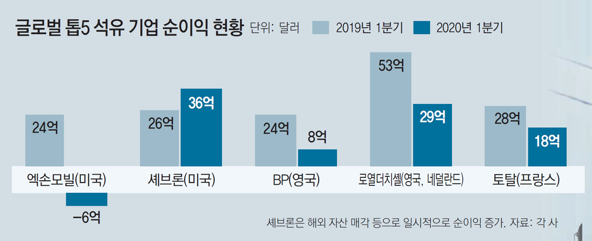 미국 최대 석유 기업 엑손모빌은 1999년 엑손과 모빌의 합병 후 21년 만에 처음으로 분기 단위 순손실(약 6억1000만 달러)을 냈다. 영국 BP는 1분기 순이익이 8억 달러로 전년 동기(24억 달러) 대비 3분의 1 수준으로 쪼그라들었다. 영국과 네덜란드 자본의 합작사 로열더치셸은 순이익이 29억 달러로 전년 동기 대비 45.2% 감소했다. 프랑스 토탈의 순이익도 18억 달러로 10억 달러 줄었다. 주요 석유 기업 중 미국 셰브론만 순이익이 증가세를 보였으나 해외 자산 매각과 환율 변동에 따른 차익 등 1회성 효과에 힘입은 것이다.