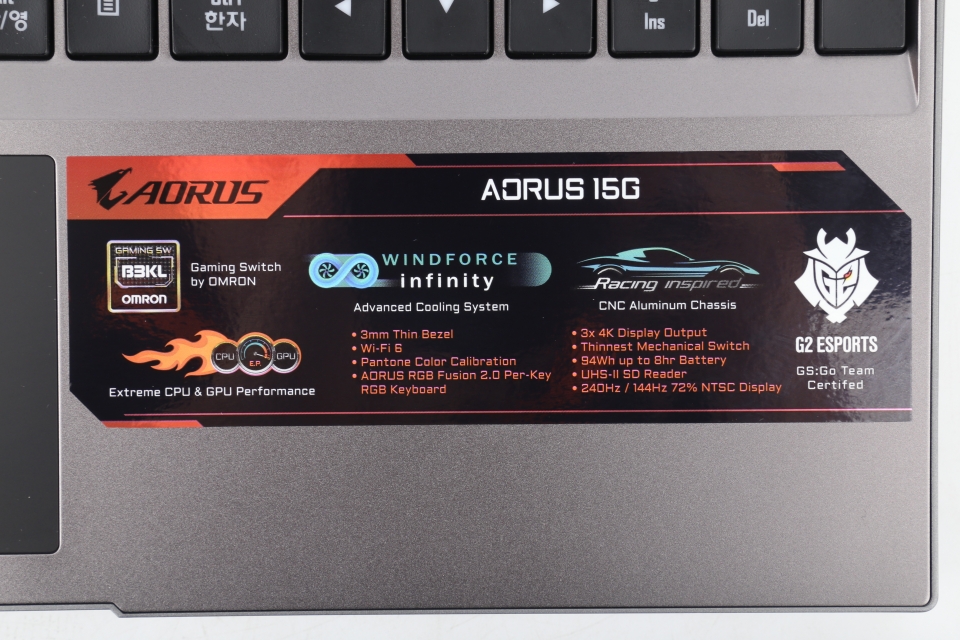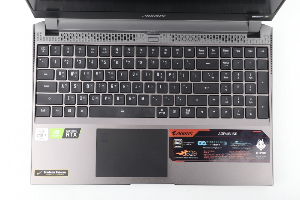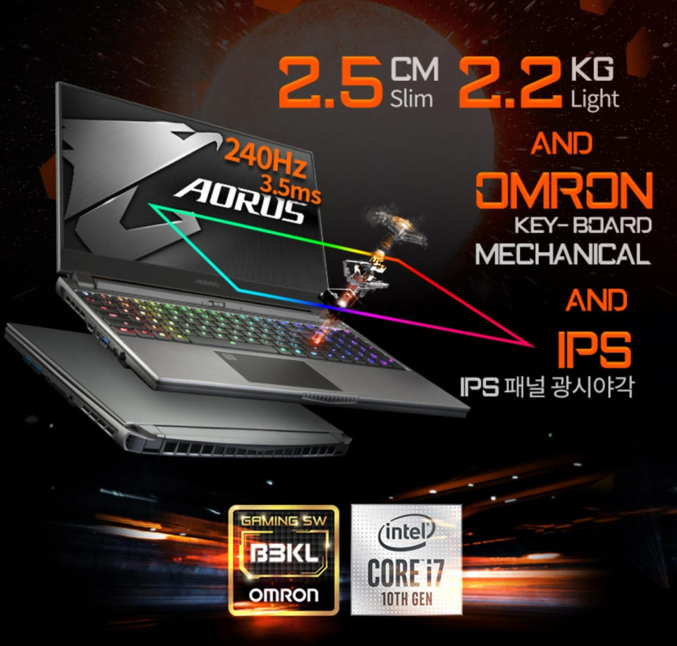 인텔 10세대 코어 프로세서가 탑재된 기가바이트 어로스 15. 슬림형 게이밍 노트북이지만 옴론 LP 청축 기계식 키보드가 탑재됐다.