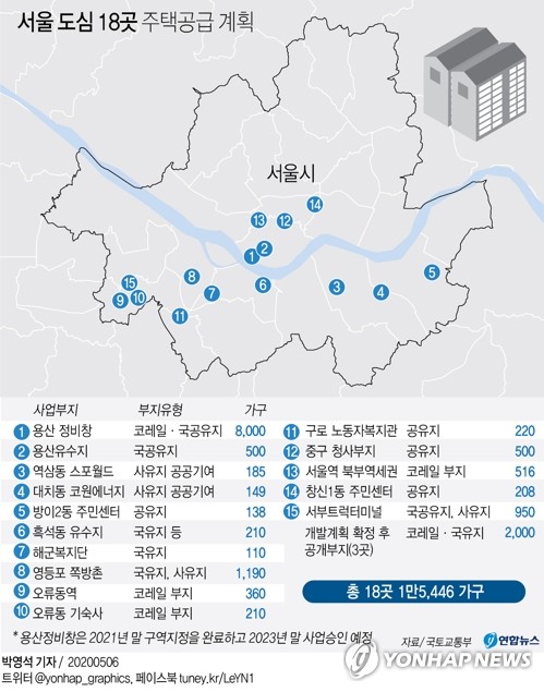 국토교통부는 6일 발표한 수도권 주택 공급대책을 통해 서울 도심 유휴부지 18곳을 개발해 주택 1만5천446가구를 공급하는 방안을 제시했다.