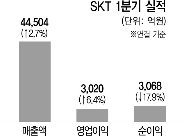 SKT는 올해 1·4분기 연결 재무제표 기준 매출 4조 4,504억원으로 전년 동기 대비 2.7% 증가했다고 7일 공시했다. 영업이익은 3,020억원으로 6.4% 감소했으며 순이익은 3,068억원을 기록했다.