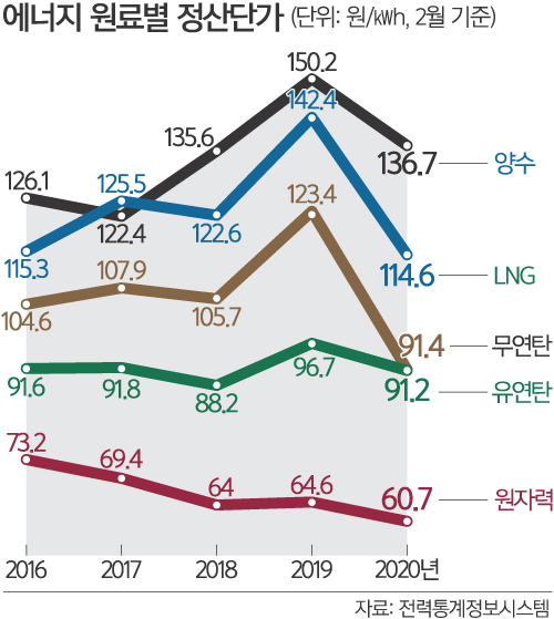 하지만 저렴한 원전·석탄 비중을 낮추고 상대적으로 비싼 LNG를 확대하면서 전기요금 상승 요인으로 작용할 수 있다는 우려가 나오고 있다. 올해 2월 기준 전력통계시스템으로 확인한 에너지 원료원별 정산단가는 ㎾h(킬로와트시)당 원자력이 60.7원, 유연탄(석탄)이 91.2원이지만 LNG는 114.6원이다.