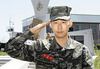 8일 제주 서귀포시 대정읍 해병 9여단에서 군복을 입고 경례하는 손흥민. /국방부 |