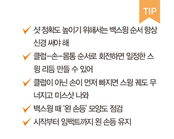 이경훈은 “백스윙은 클럽 헤드부터 움직임이 시작돼 손과 몸통 순서로 회전해야 한다. 드라이버샷부터 아이언샷까지 정확성과 일관성을 높이기 위해서 백스윙 시작 때 스윙 순서를 신경 써서 연습하고 있다”고 설명합니다.